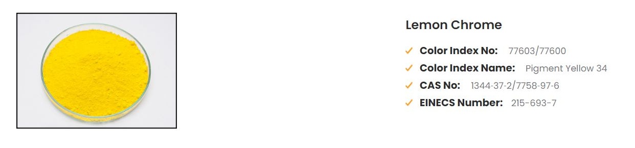 Lemon Chrome - a monoclinic Lead Chromate material. Its of shade and a cleaner Full Tone. This pigment is highly stabilized and offers very good fastness to light and weathering and therefore is extensively used in
